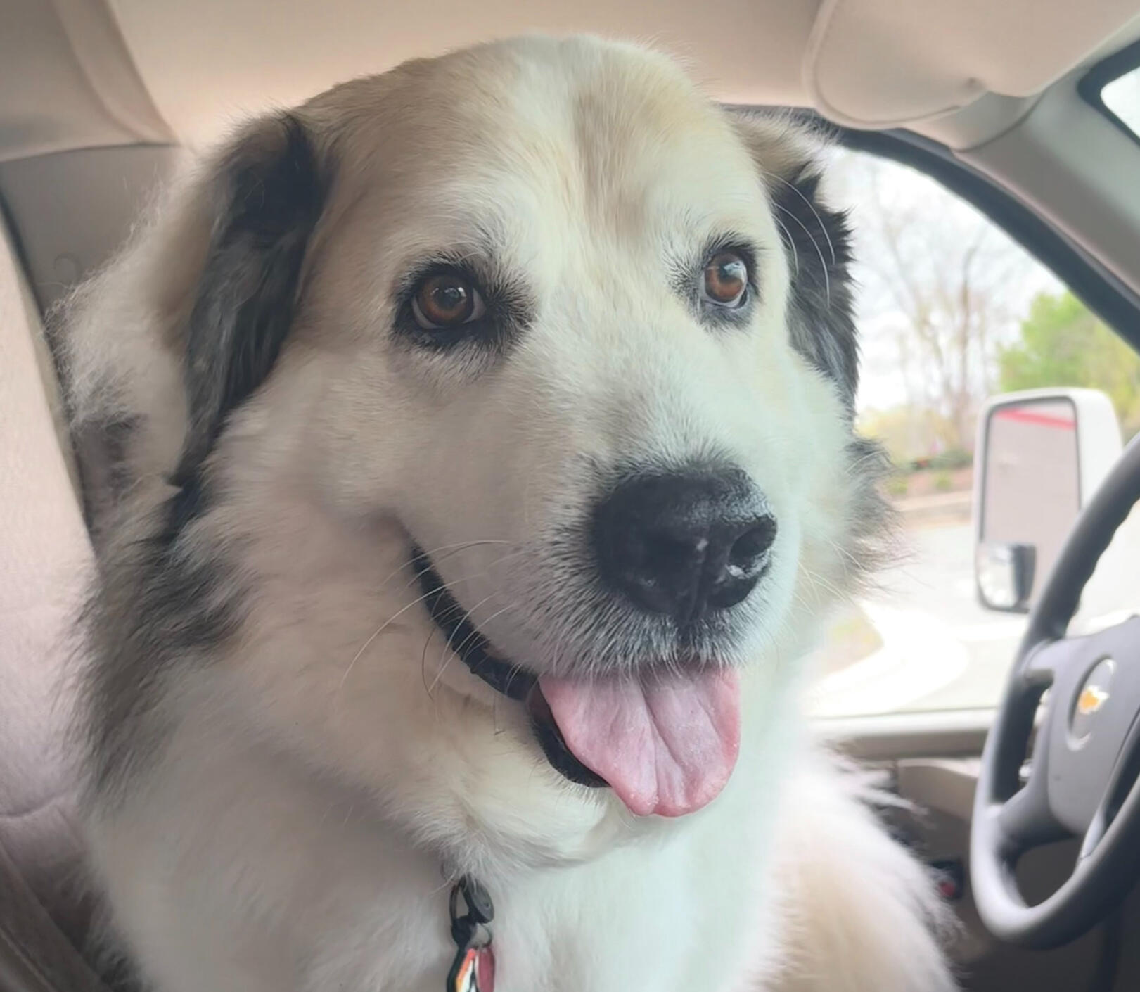 Beorn is our gentle Great Pyrenees who rides along everyday.